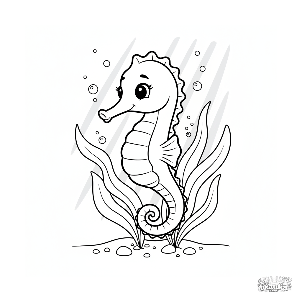 Página para colorir de um cavalo-marinho em algas marinhas em águas rasas iluminadas pelo sol. Para crianças de 4 a 6 anos.