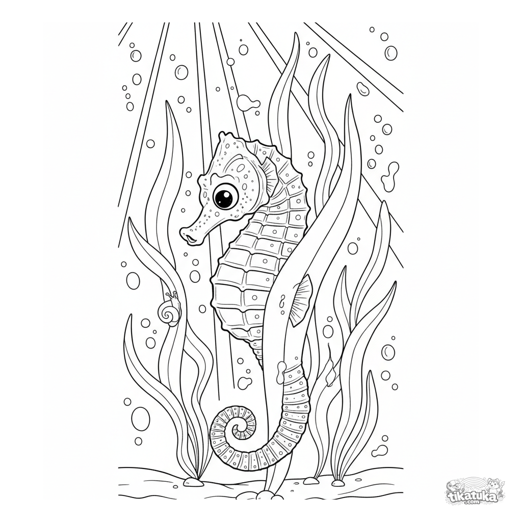 Página detalhada para colorir de um cavalo-marinho agarrado a algas em uma floresta subaquática iluminada pelo sol no raso.