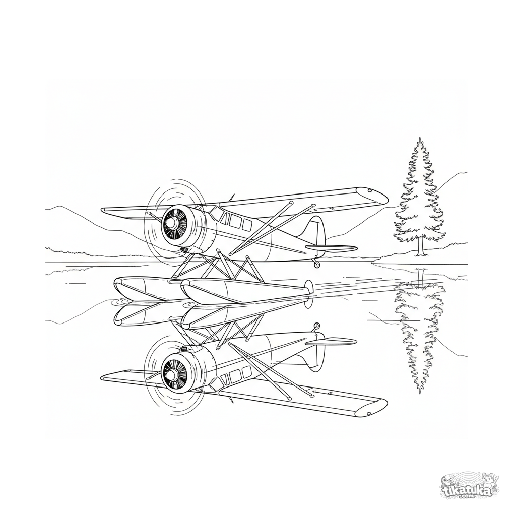Página para colorir para crianças de 7-9 anos: um hidroavião com flutuadores se move pela superfície lisa de um lago de montanha.