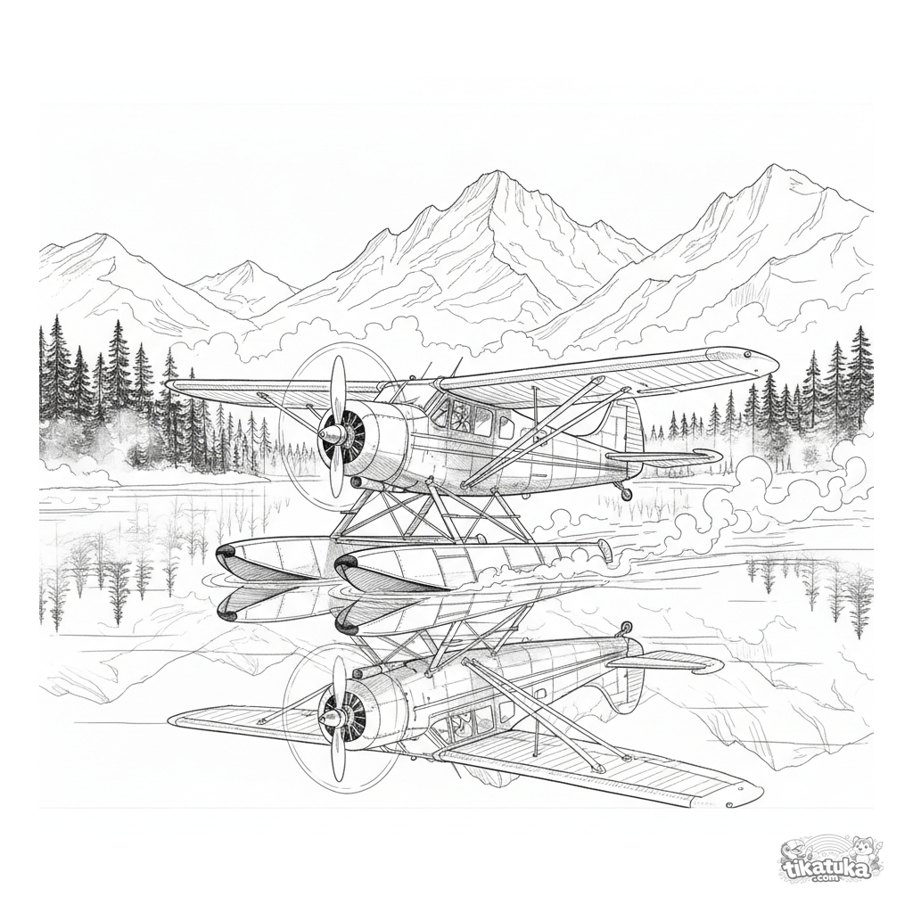 Página para colorir detalhada de um hidroavião para 10-12 anos. O avião taxia na superfície espelhada de um lago montanhoso ao amanhecer. Cena pacífica com elementos de paisagem.