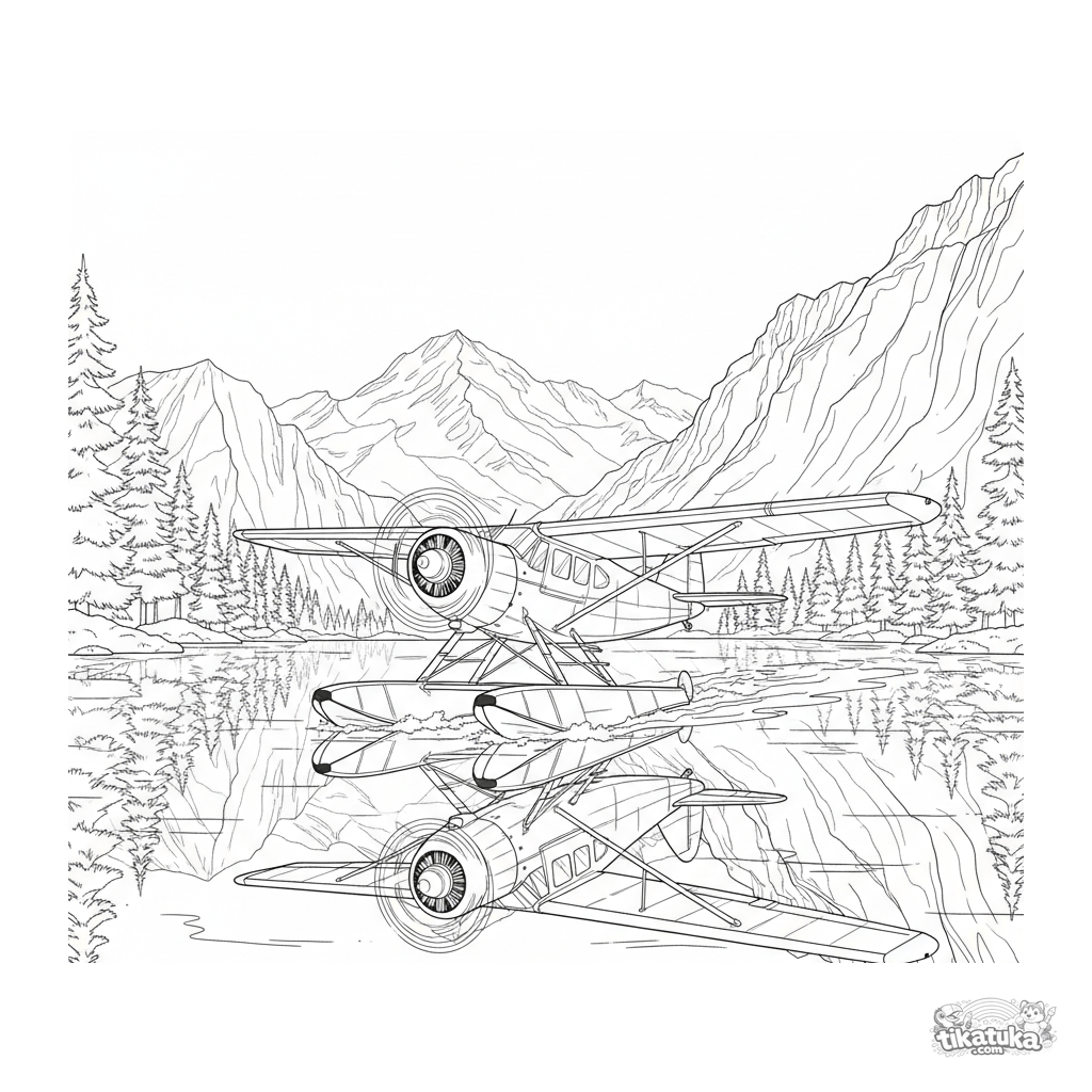 Página para colorir detalhada de um hidroavião num lago de montanha. Para 10-12 anos. Com montanhas, pinheiros e respingos.