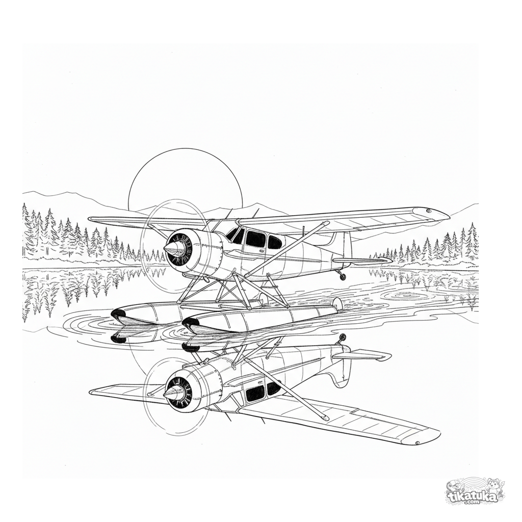 Página para colorir de um hidroavião taxiando na superfície calma de um lago de montanha ao pôr do sol. Cena detalhada com reflexos e pinheiros. Para 10-12 anos.