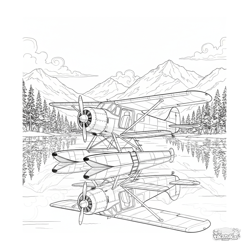Página para colorir detalhada no estilo esboço de aquarela: um hidroavião com flutuadores repousa em um lago de montanha calmo. Para crianças mais velhas de 10 a 12 anos. Reflexo na água é visível.