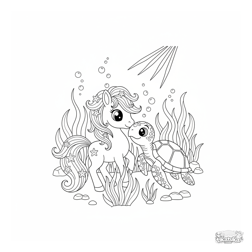 Página para colorir para meninas de 4-6 anos: um pônei marinho mágico com uma juba brilhante cumprimenta uma tartaruga marinha amigável num tranquilo prado subaquático.