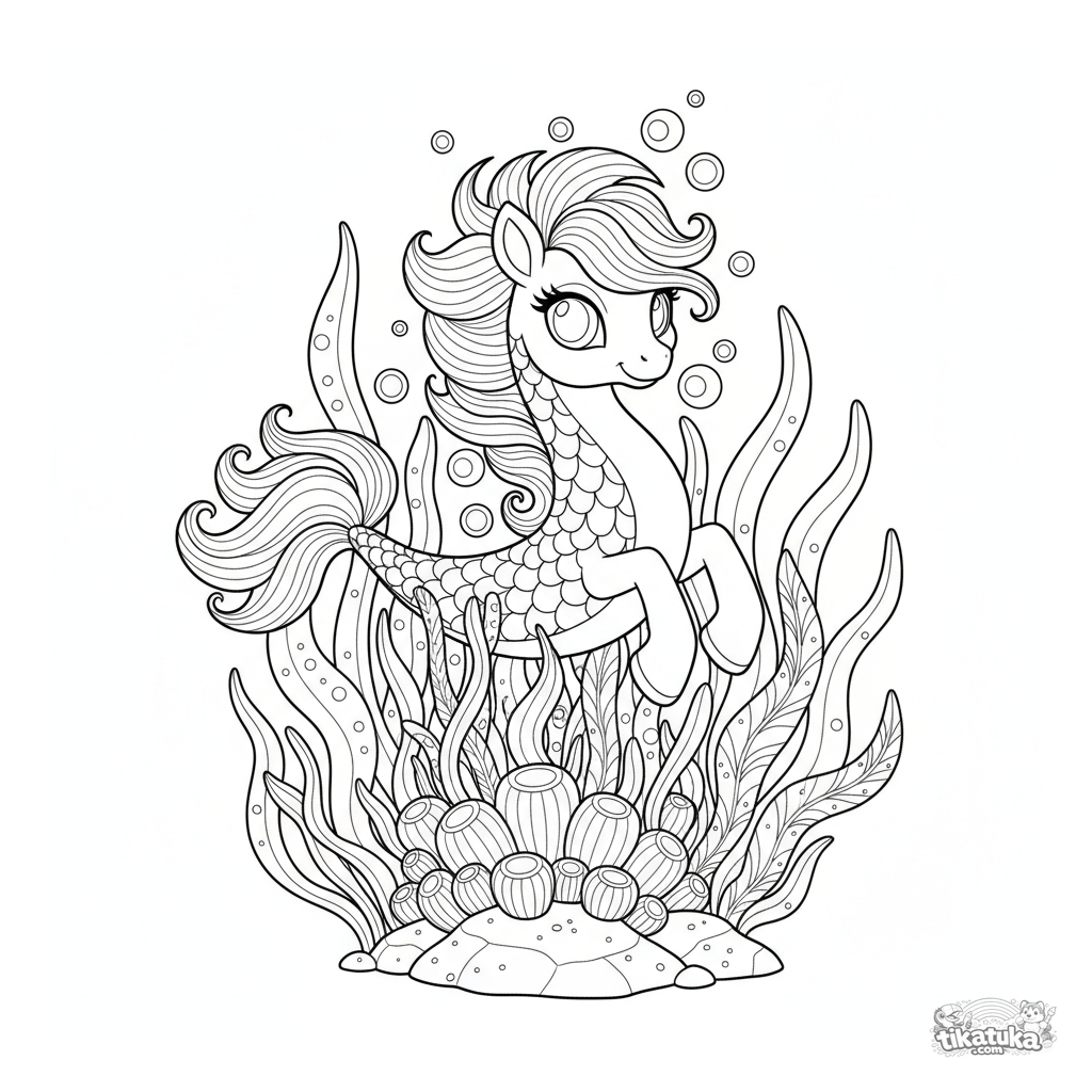 Página para colorir difícil: um pônei marinho com crina brilhante numa floresta de algas mágica. Para crianças de 8 a 12 anos. Estilo cartoon detalhado.