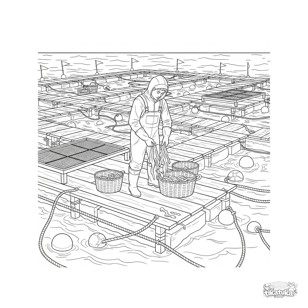 Página para colorir para 10-12 anos: uma fazenda de algas flutuante detalhada. Cena com fazendeiro, redes, bóias e cestos para colorir criativamente.