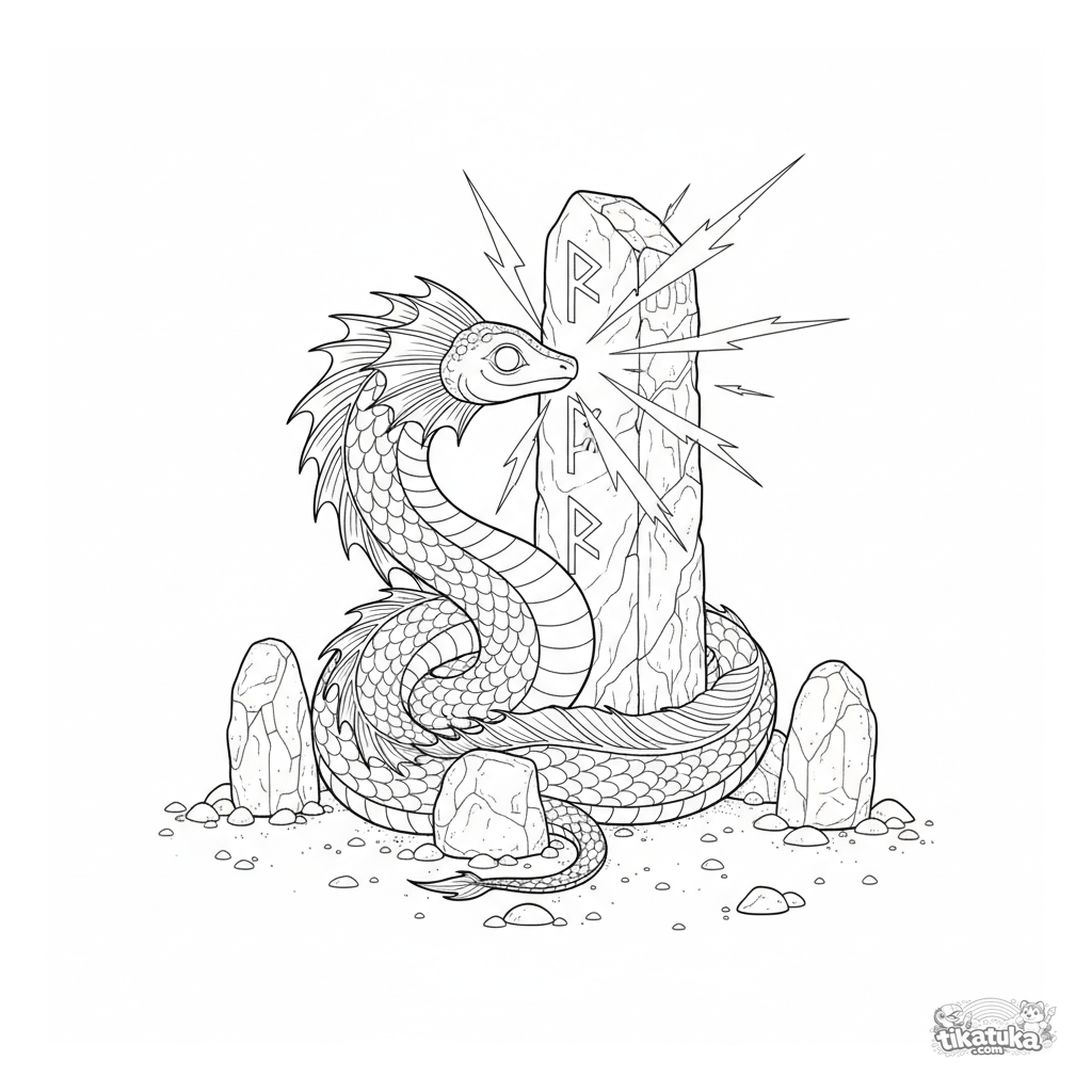 Página para colorir para 10-12 anos: uma serpente marinha guardiã se enrola em torno de um monólito rúnico. Cena detalhada em estilo realista para jovens artistas.