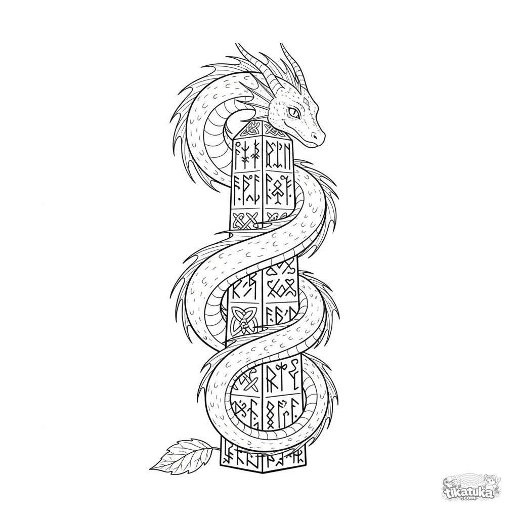 Página para colorir complexa para 10-12 anos: um dragão serpentino se enrola em torno de um antigo monólito rúnico. Anatomia detalhada, linhas realistas, atmosfera lendária.