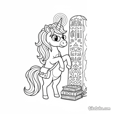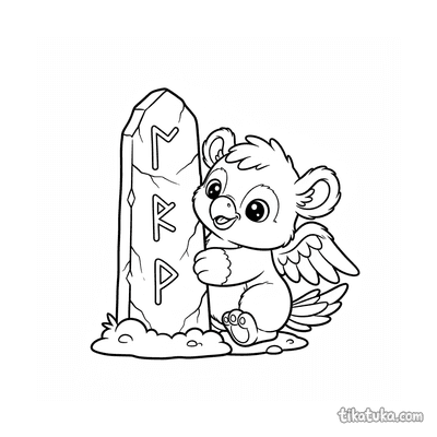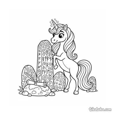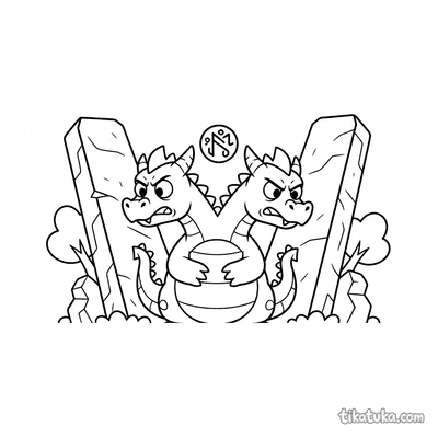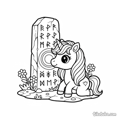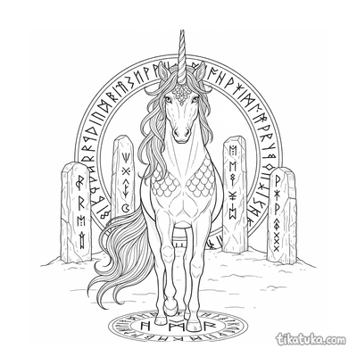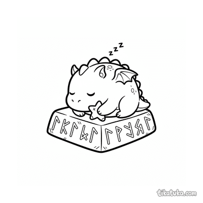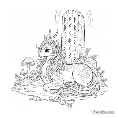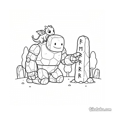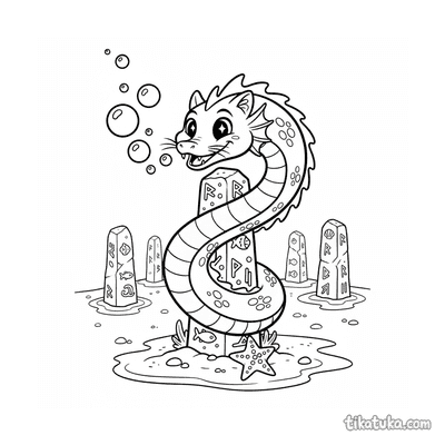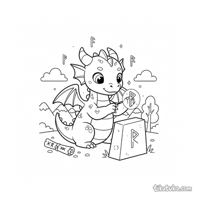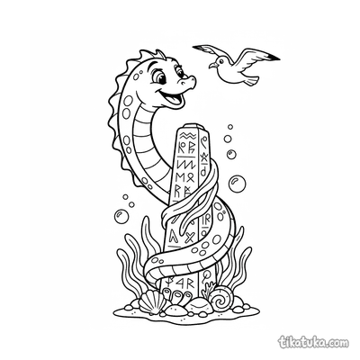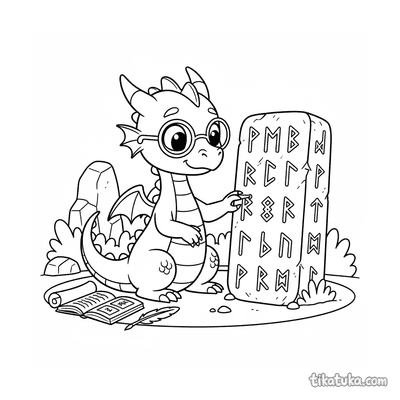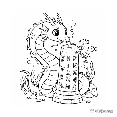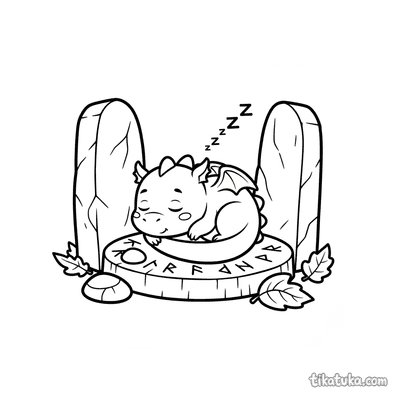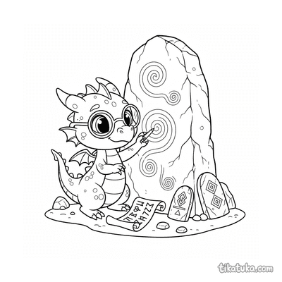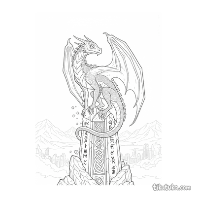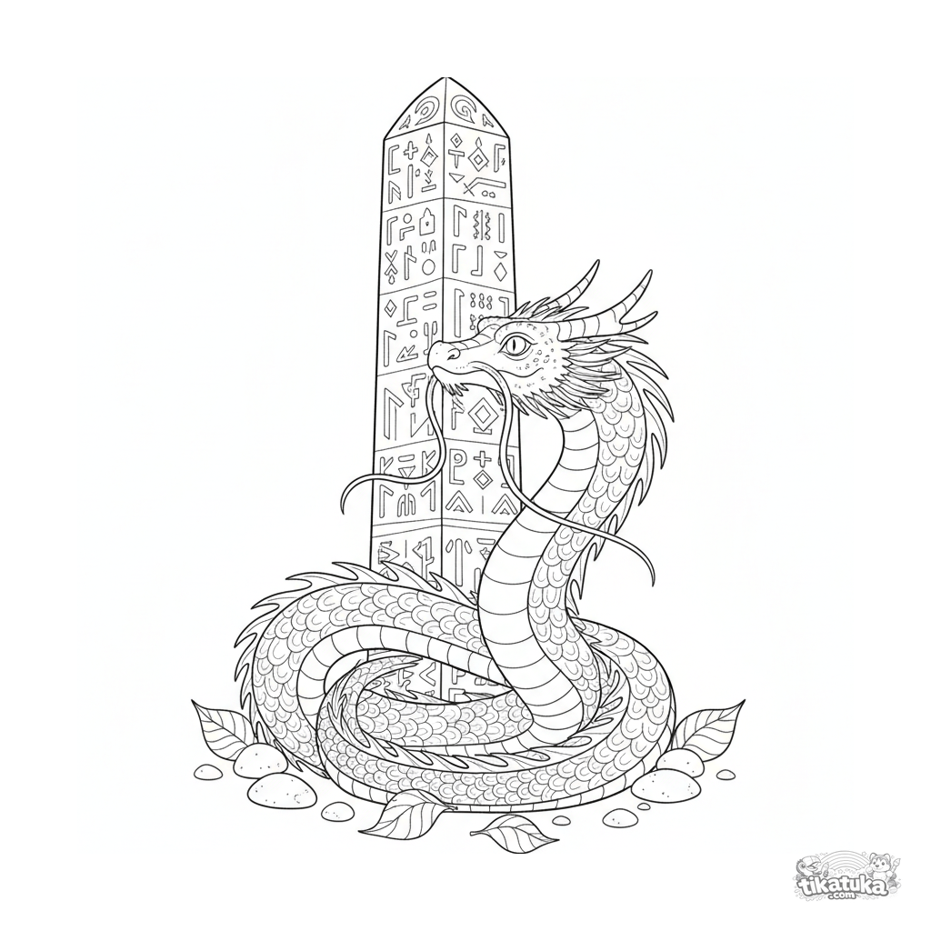 Página para colorir para 10-12 anos: um dragão serpentino detalhado se enrola em torno de um antigo monólito rúnico. Contornos limpos, proporções naturalistas, atmosfera de lenda.