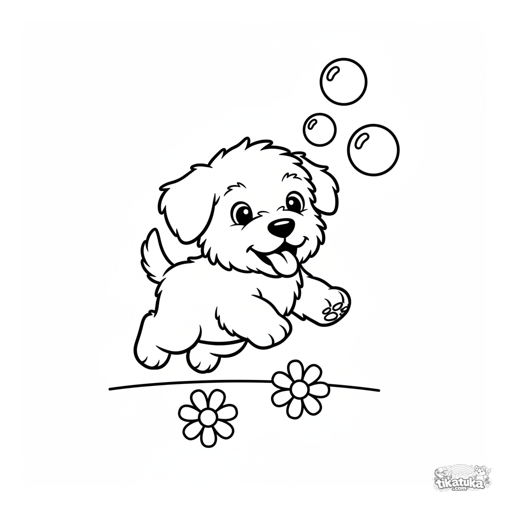Página para colorir fácil para crianças pequenas: um filhote de cão pastor persegue bolhas de sabão em um campo. Formas grandes e simples com amplas margens brancas.