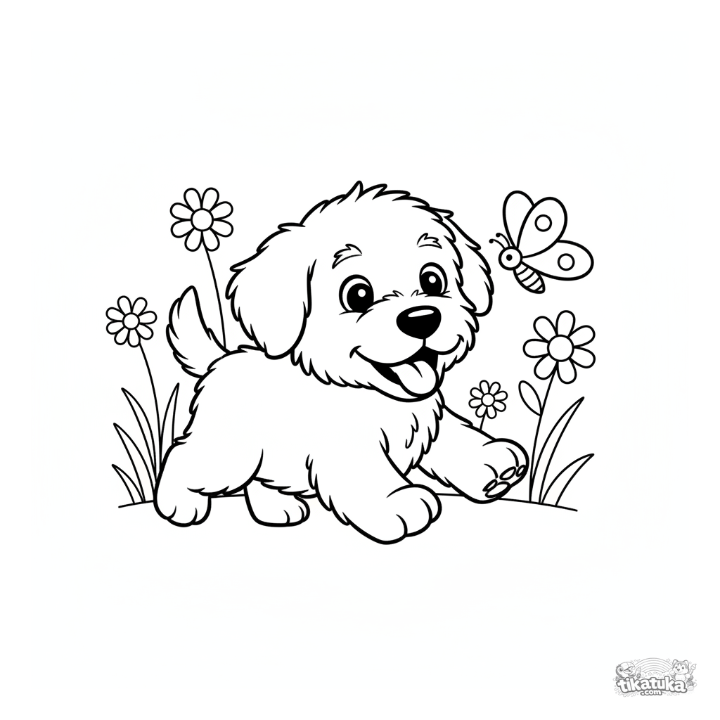 Página para colorir fácil para crianças pequenas: um filhote de cão pastor persegue feliz uma mariposa em um campo de margaridas. Formas grandes e simples.
