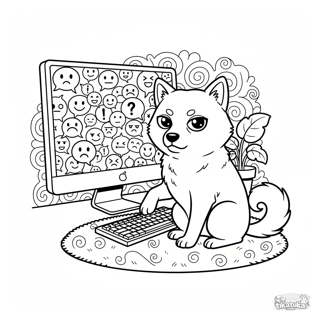 Página para colorir para crianças 7-12: um cachorro Shiba Inu esperto com expressão de julgamento cético olha de lado para uma janela de chat bagunçada em um monitor. Cena engraçada e reconhecível.
