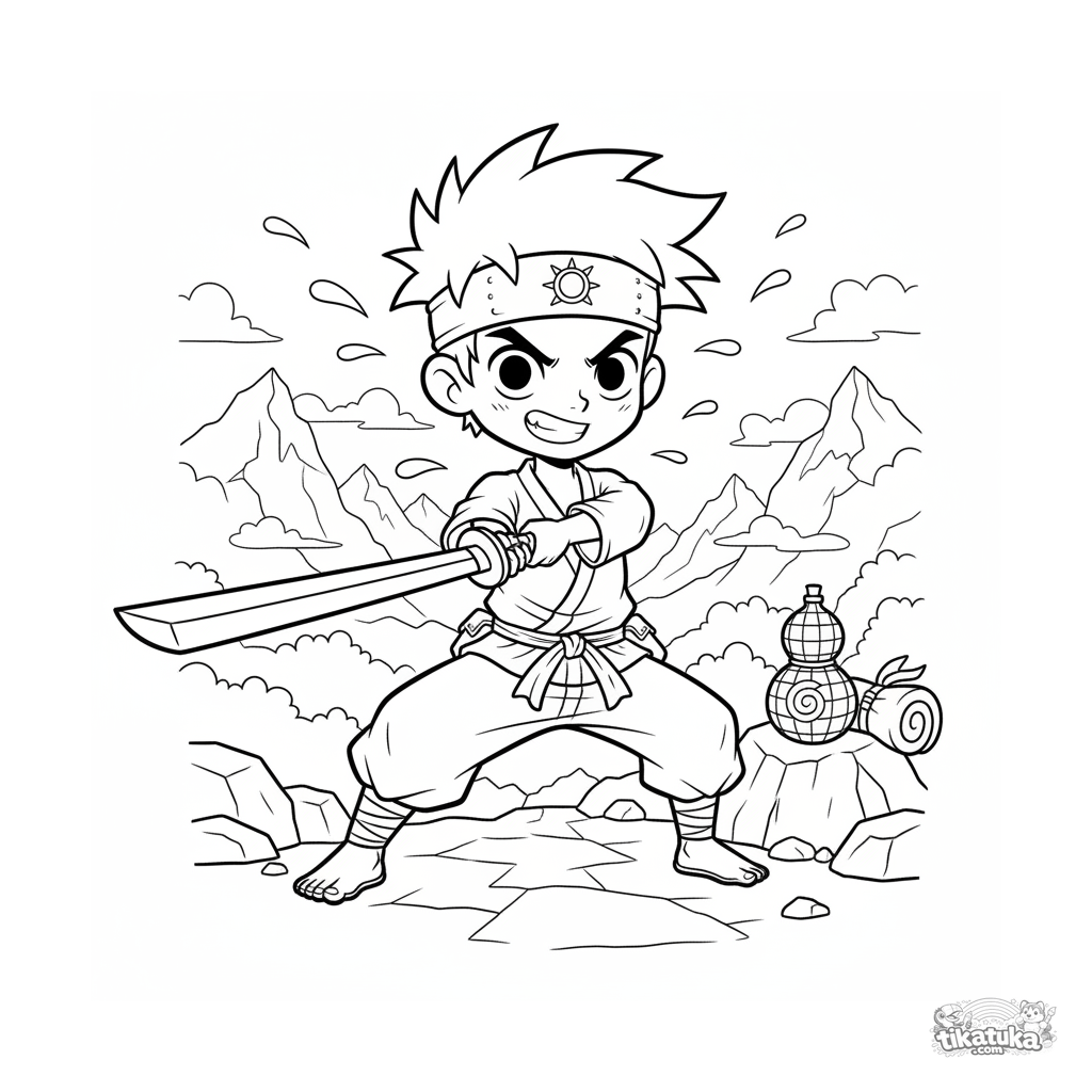 Página para colorir anime shonen dinâmica: um herói treina com uma espada de madeira em uma trilha de montanha ao amanhecer. Paisagem e pose detalhadas para crianças de 10-12 anos.