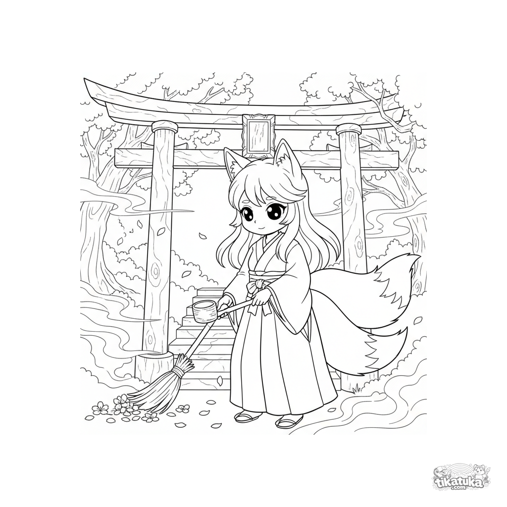 Página para colorir estilo anime: uma sacerdotisa espírito raposa limpa um portão torii de pedra ao amanhecer. Cena detalhada para 10-12 anos.
