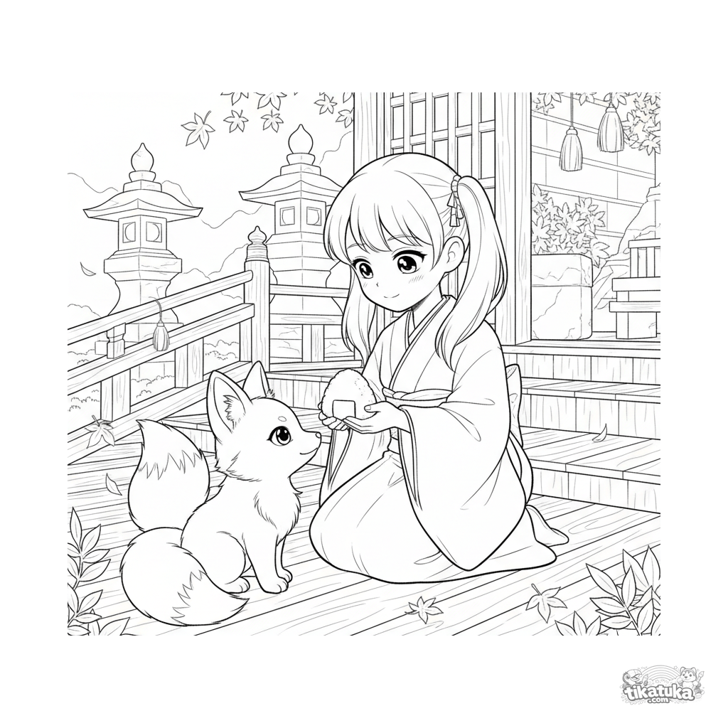 Página para colorir estilo anime para 10-12 anos: uma sacerdotisa alimenta um espírito raposa bebê na varanda de um santuário de montanha em uma noite de outono.