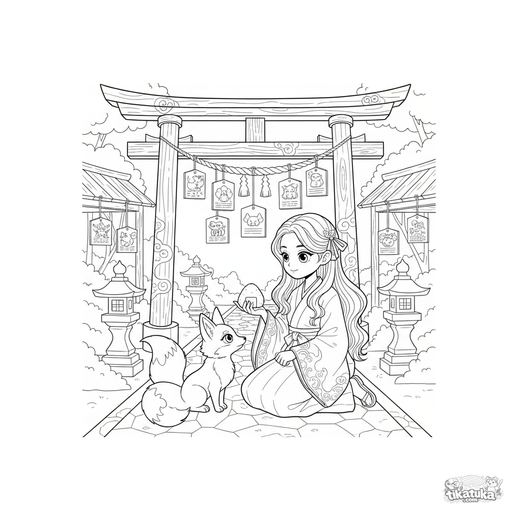 Página para colorir no estilo anime: uma sacerdotisa alimenta um espírito raposa kitsune sob um portão torii. Fundo detalhado de santuário com lanternas de pedra. Para crianças de 10-12 anos.