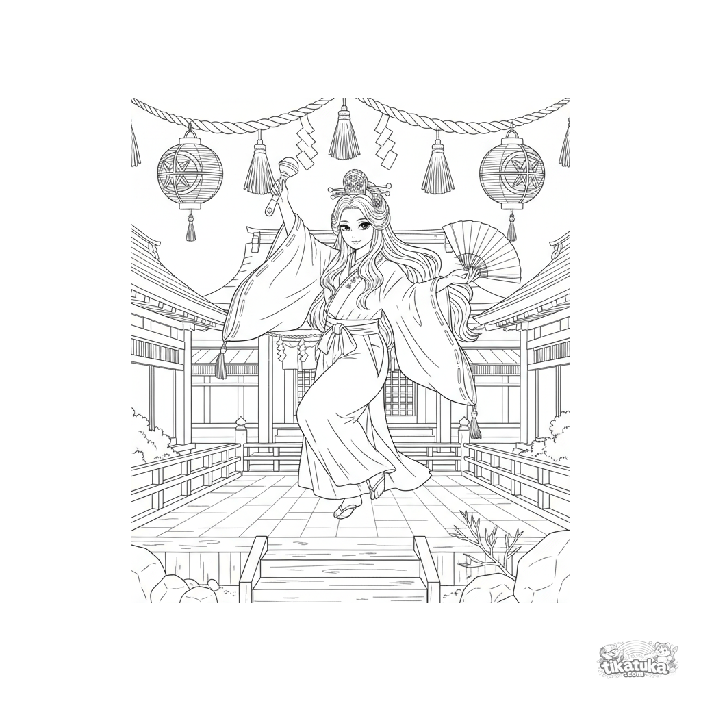 Página para colorir anime realista: uma sacerdotisa realiza a dança cerimonial Kagura. Cena detalhada com trajes e decorações tradicionais para 10-12 anos.