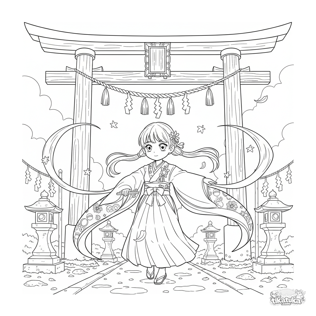 Página para colorir estilo anime para 10-12 anos: uma sacerdotisa executa uma dança cerimonial Kagura sob um grande portão torii em um santuario outonal.