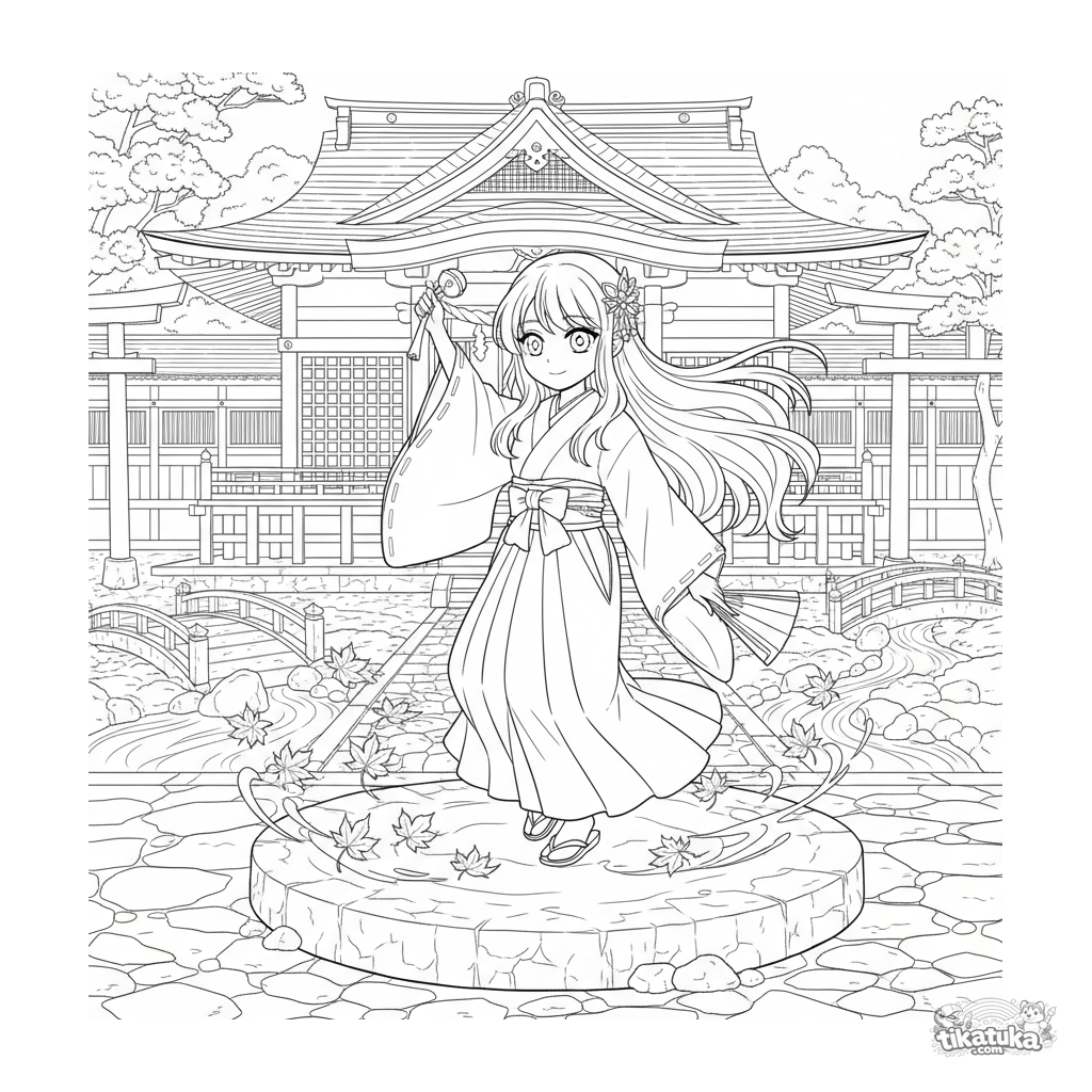 Página para colorir estilo anime: uma sacerdotisa executa uma dança cerimonial Kagura no pátio de um santuario outonal. Cena detalhada para 10-12 anos com fundo intrincado.