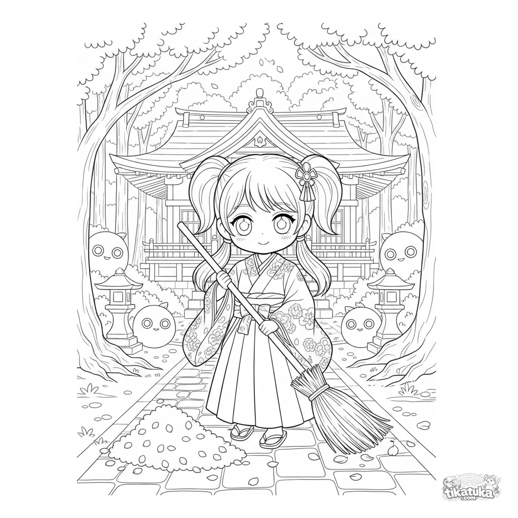 Página para colorir anime detalhada: uma sacerdotisa varre o pátio do santuário com ajuda de espíritos kodama. Cena com fundo para 10-12 anos.