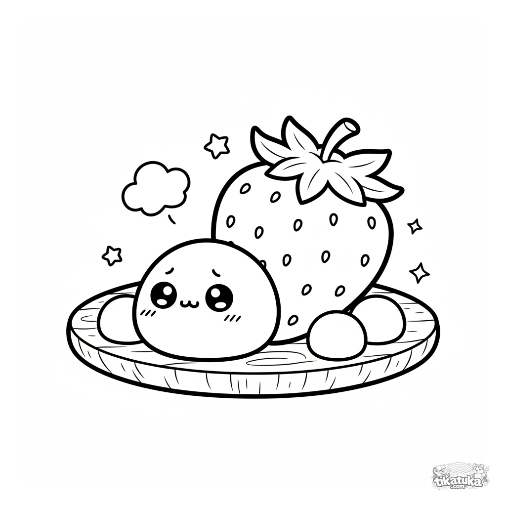 Página para colorir para crianças 4-6: um mochi fofo e tímido espreita por trás de um morango gigante em uma travessa de sobremesa. Cena simples e adorável.