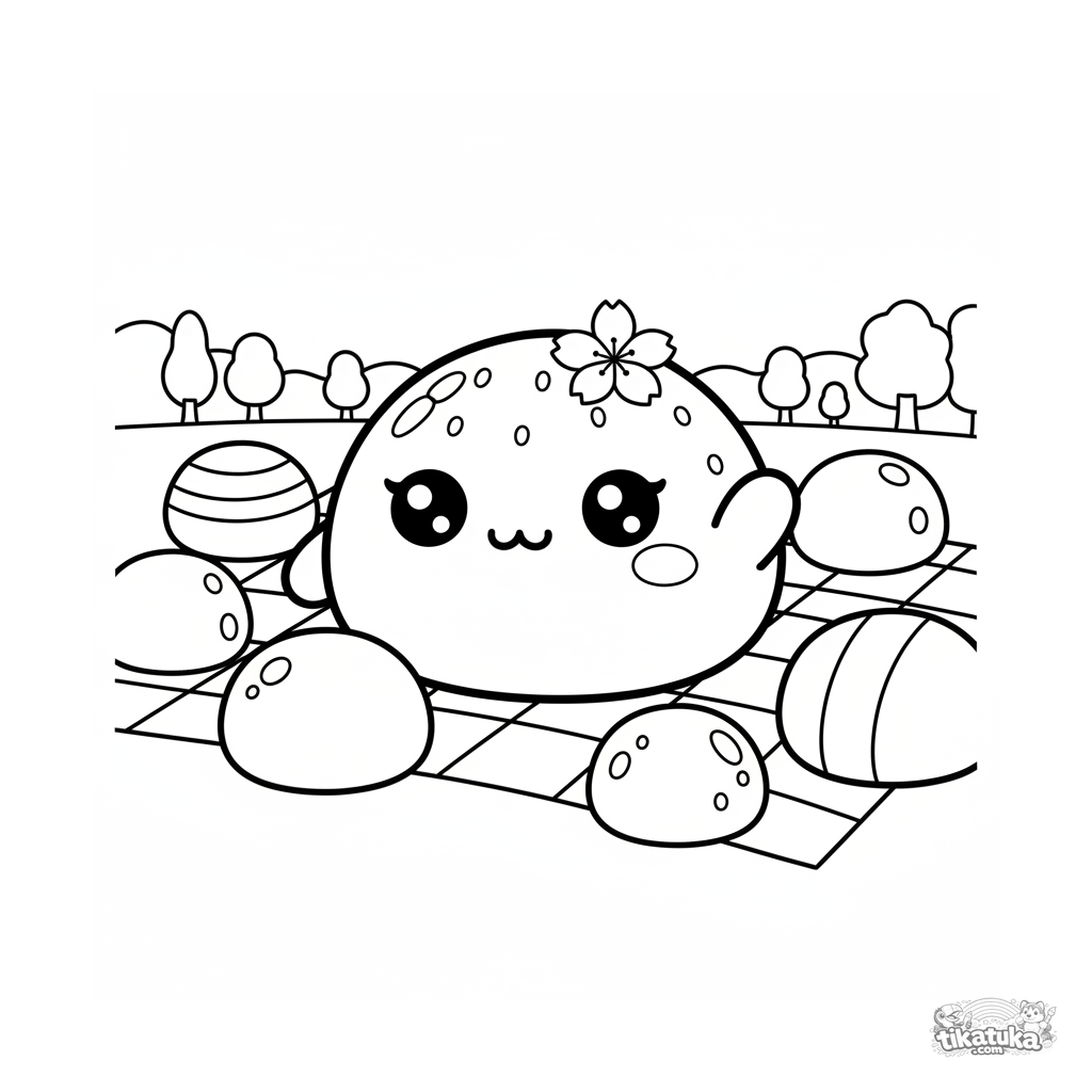 Página para colorir para crianças de 7-9 anos: um mochi de morango tímido sentado em um cobertor de piquenique xadrez.