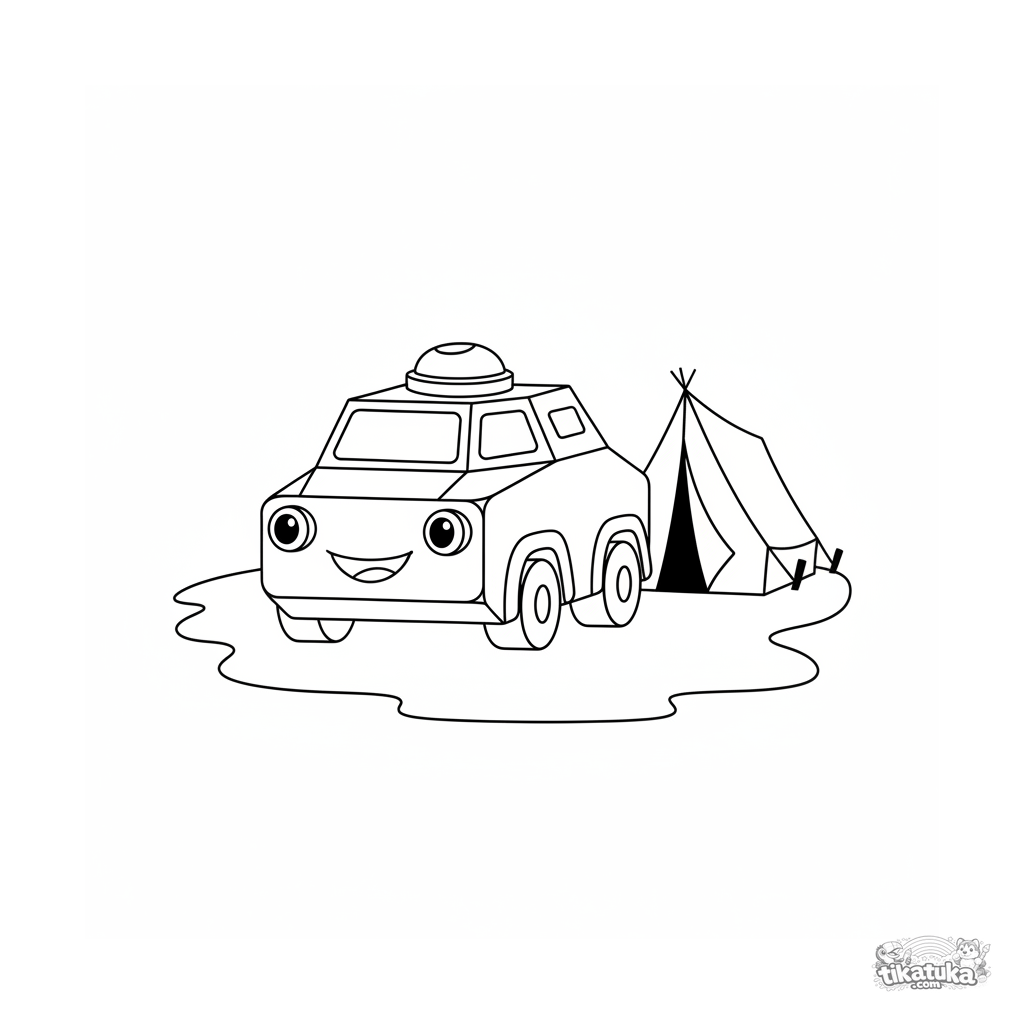 Página para colorir simples para bebês 2-3: um carro blindado amigável com um sorriso está estacionado perto de uma barraca de quartel de campo.