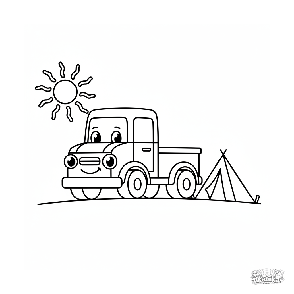 Página para colorir muito simples para bebês de 2-3 anos: um caminhão do exército sorridente estacionado perto de uma barraca. Grandes margens brancas, contornos grossos.