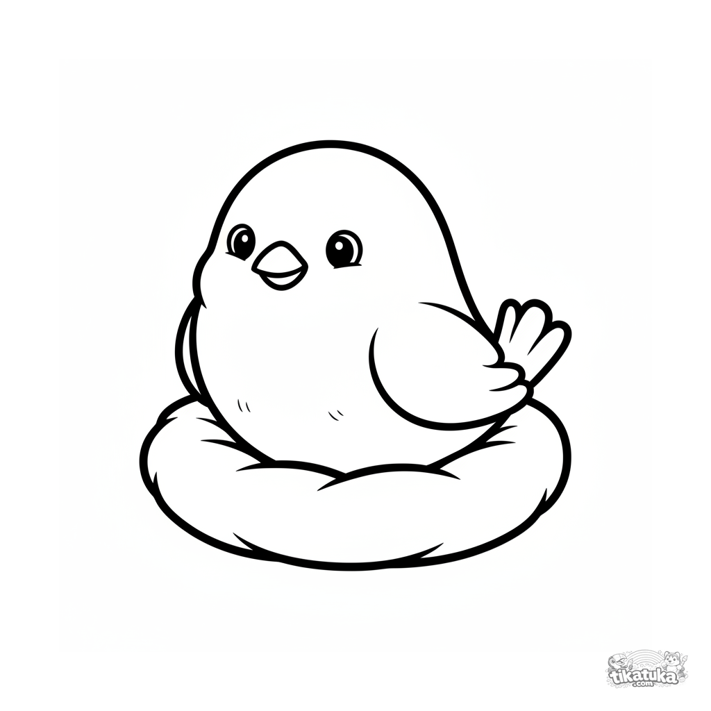 Página para colorir para 2-3 anos: um pássaro simples sentado em um travesseiro que parece um ninho. Silhueta reconhecível clara, design minimalista.