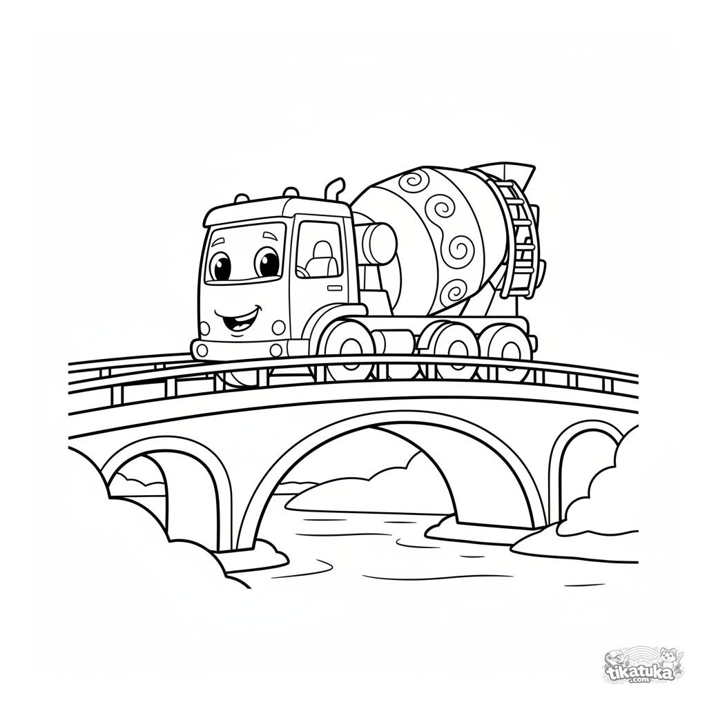 Página para colorir muito simples para crianças pequenas 2-3: um grande caminhão betoneira em uma ponte. Formas grandes e claras.
