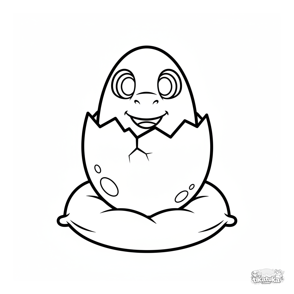 Página para colorir para crianças pequenas: um ovo grande de dinossauro com um rosto amigável espiando de uma rachadura, sentado em uma almofada macia. Contornos limpos, detalhes mínimos, perfeito para 2-3 anos.