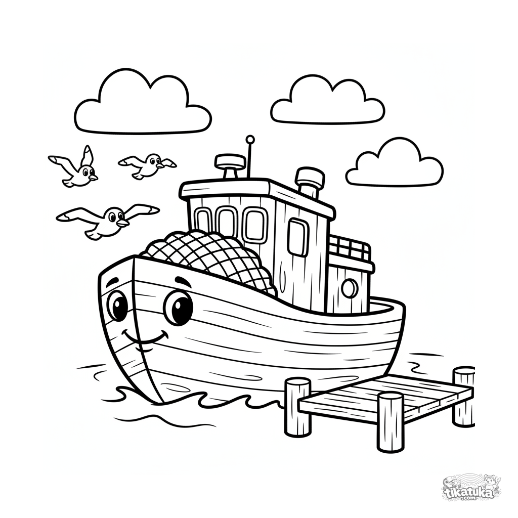 Página para colorir para crianças pequenas: um arrastreiro de pesca simples parte do cais. Formas grandes e claras que lembram um brinquedo de madeira.