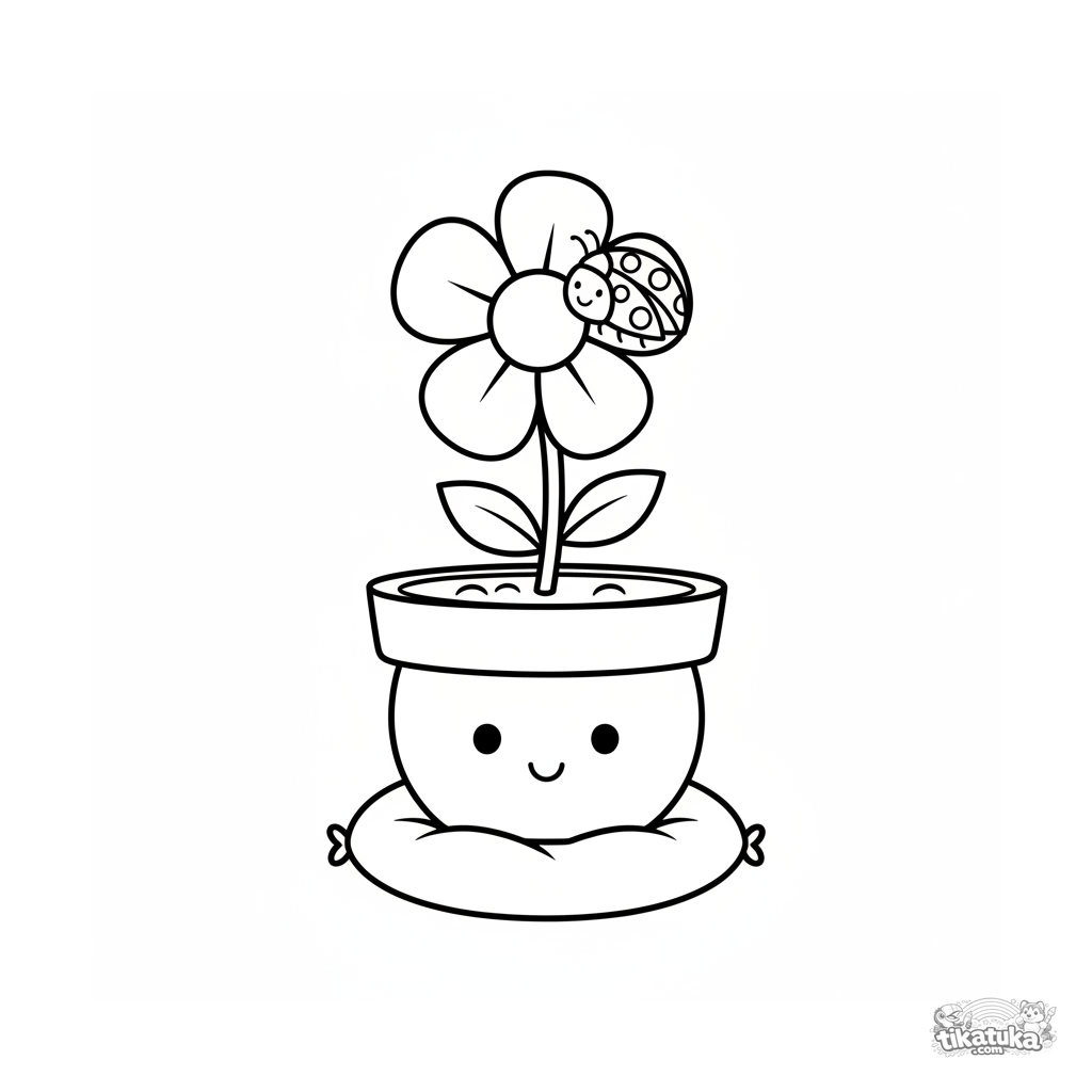 Página para colorir para crianças de 2-3 anos: uma flor sorridente em um vaso está em um travesseiro macio, uma joaninha senta em uma pétala. Contornos muito simples.