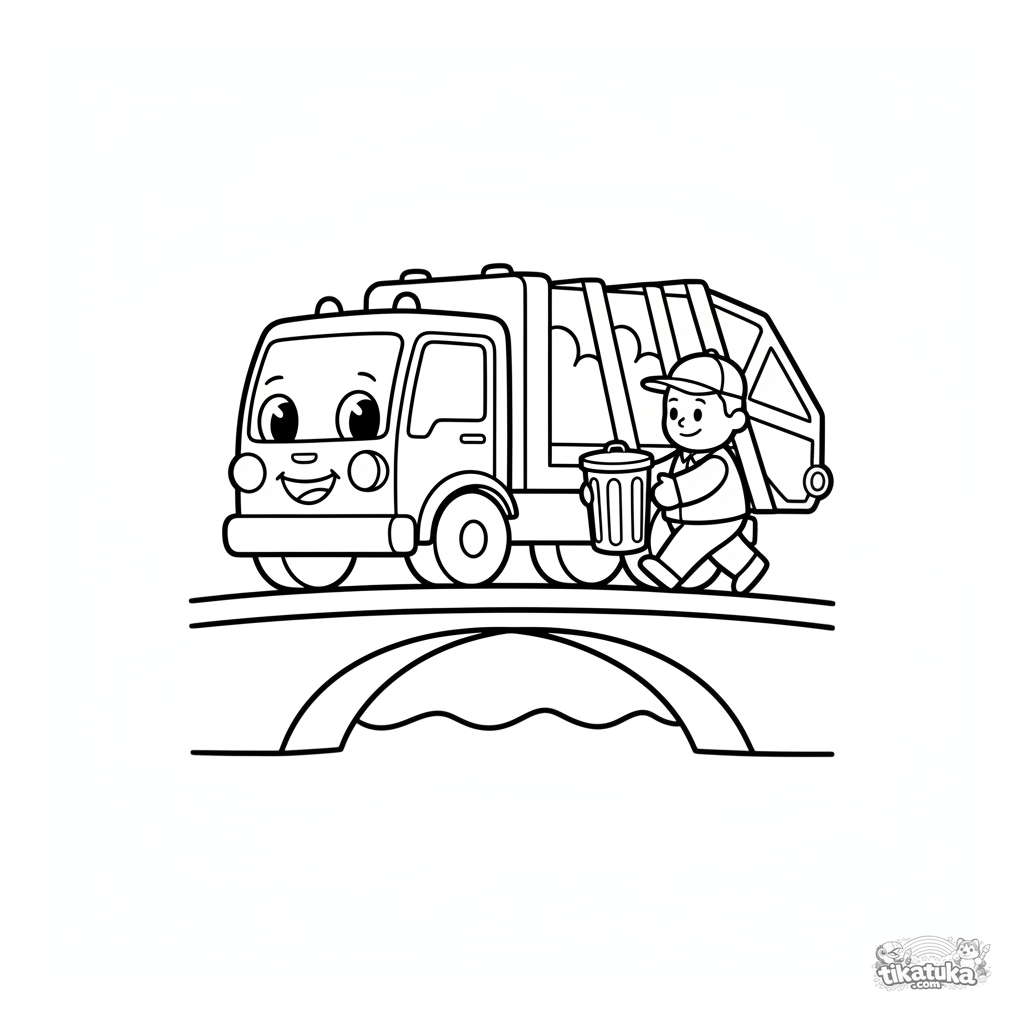 Página muito simples para colorir para bebês 2-3: um caminhão de lixo amigável dirige por uma ponte. Formas grandes e simples, quase sem detalhes, perfeito.