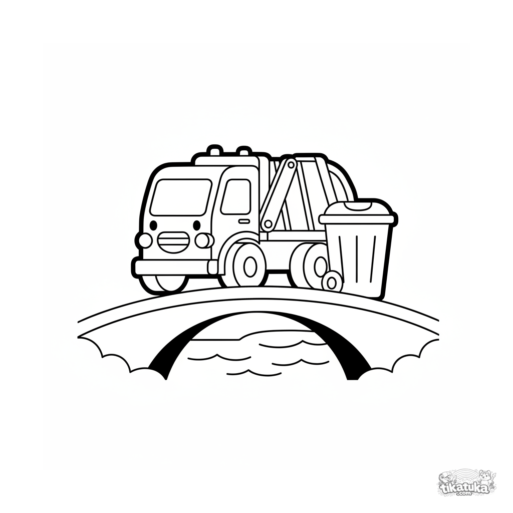 Página para colorir super simples para bebês 2-3: um caminhão de lixo feliz com o braço levantado está parado em uma ponte sobre um rio. Contornos muito grossos.