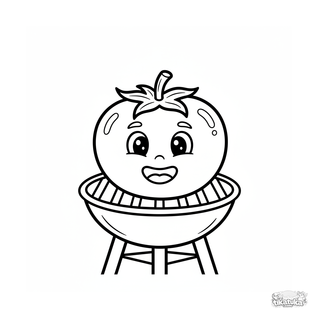 Página para colorir muito simples para crianças pequenas 2-3: um tomate grande e feliz em uma grelha. Formas grandes e contornos grossos são perfeitos para primeiros lápis de cor.