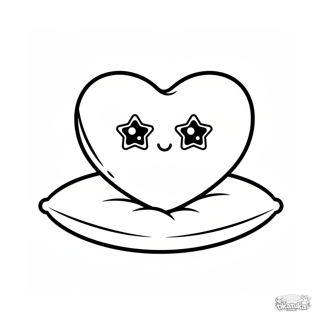Página para colorir para 2-3 anos: um grande travesseiro em forma de coração com rosto sorridente repousa em um travesseiro base macio. Muito simples.