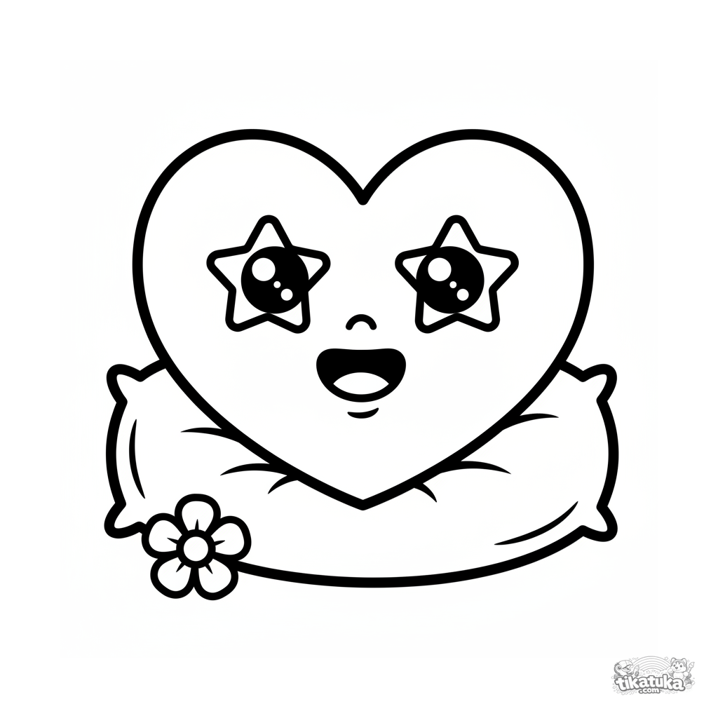 Página para colorir muito simples para 2+ anos: um coração grande com rosto sorridente descansa em uma almofada. Perfeito para primeiras experiências.