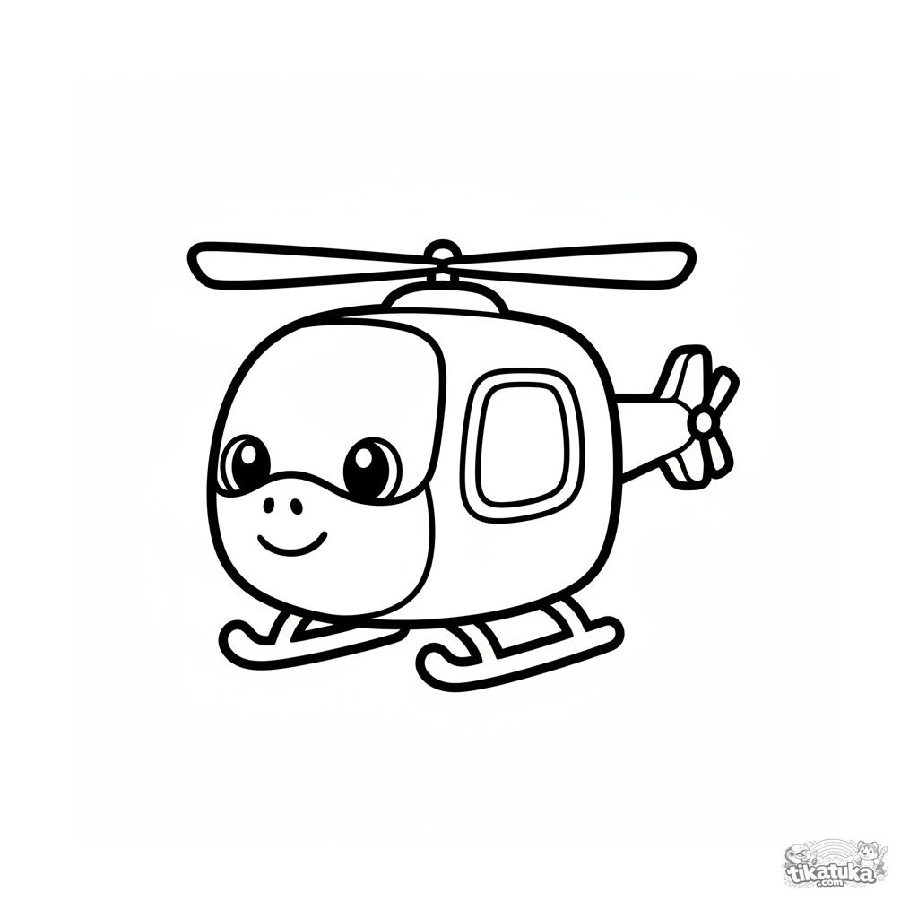 Página para colorir muito simples de um helicóptero sorridente para bebês (2-3 anos). Formas grandes e claras, muito espaço aberto para colorir.
