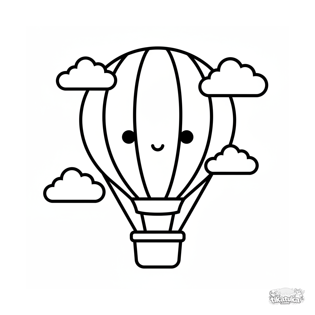 Página para colorir muito simples para crianças pequenas de 2-3 anos: um balão de ar quente listrado flutua nas nuvens. Grandes áreas para colorir.