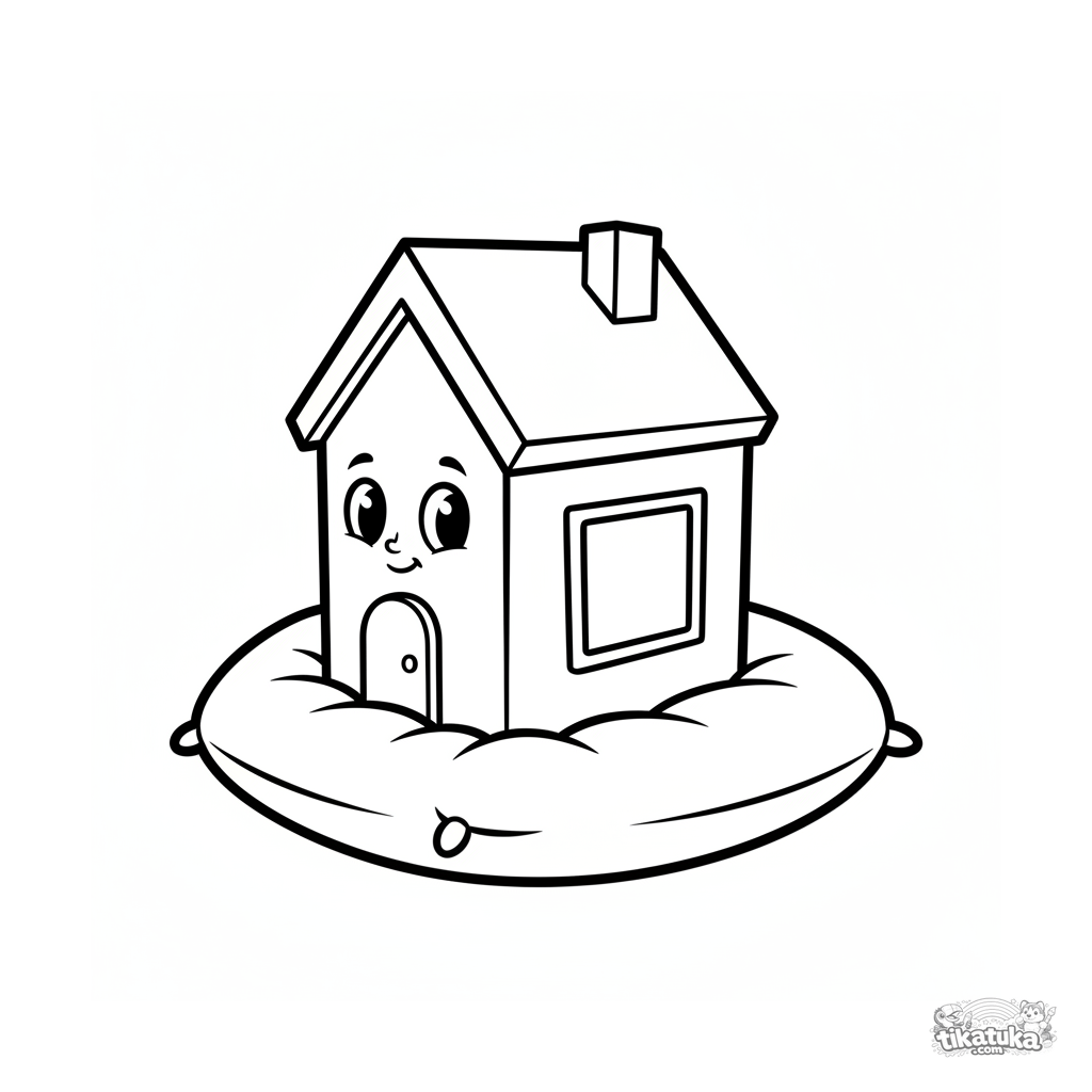 Página muito simples para colorir para crianças de 2-3 anos: uma casa geométrica sentada em uma almofada macia. Formas grandes e claras, detalhes mínimos, margens amplas.