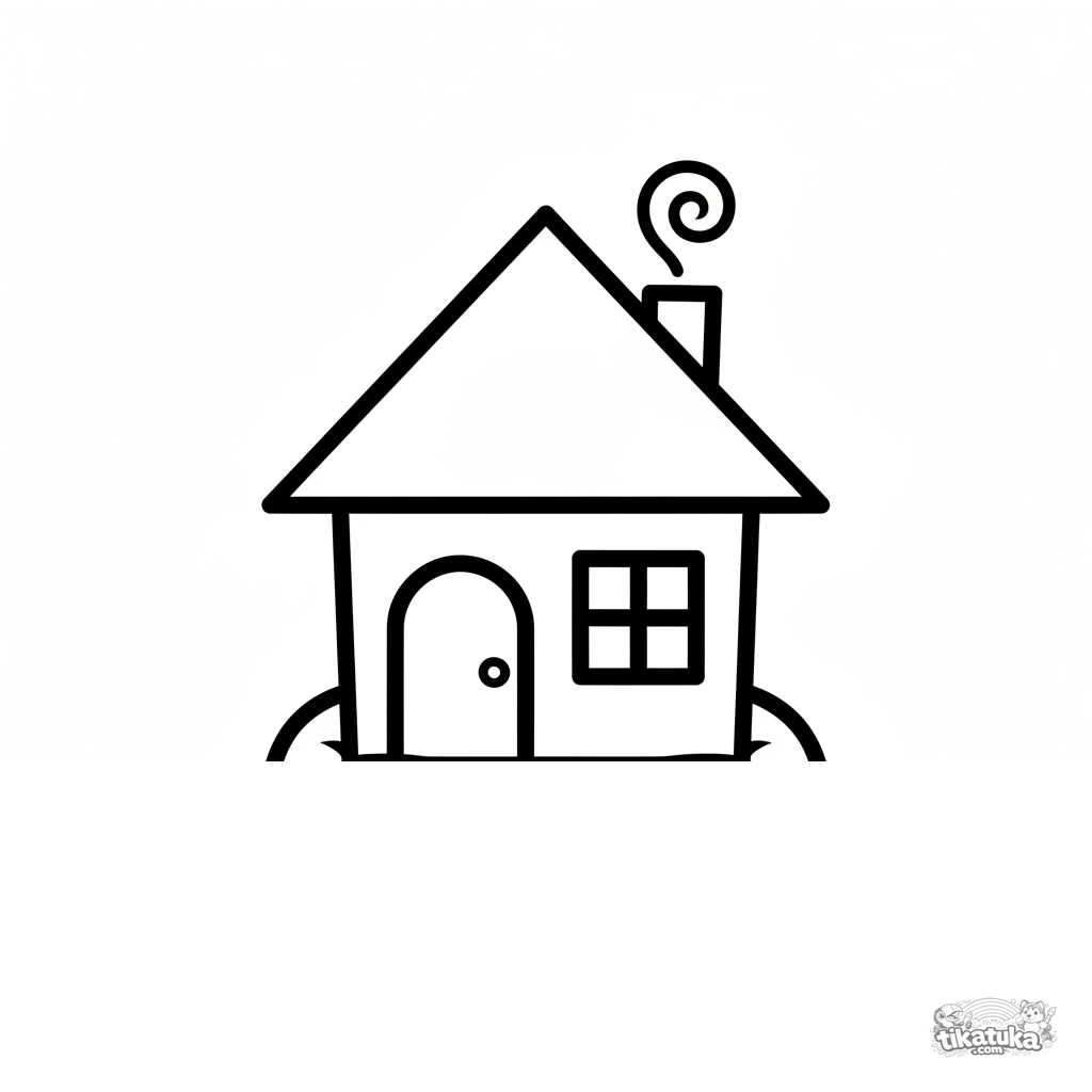 Página simples para colorir para 2-3 anos: uma casa aconchegante com chaminé sentada em um travesseiro macio. Formas geométricas, contornos claros, poucos detalhes.