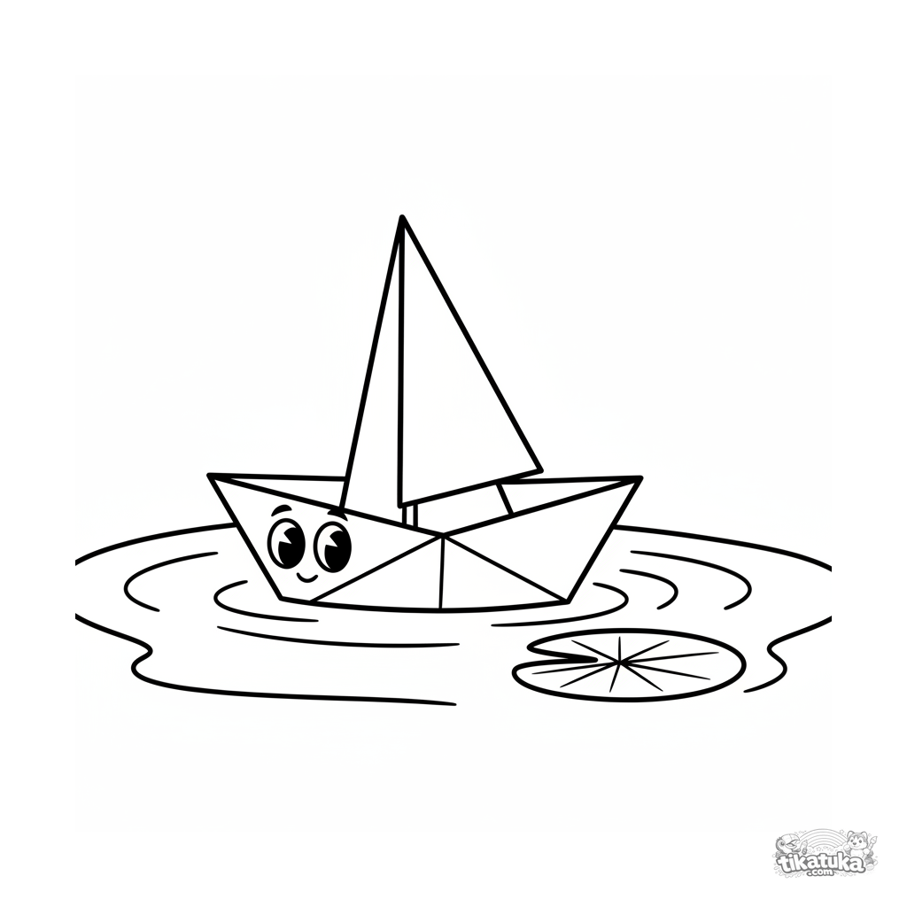 Página para colorir muito simples para crianças pequenas a partir de 2 anos: um barco de papel de origami flutua em um lago calmo.