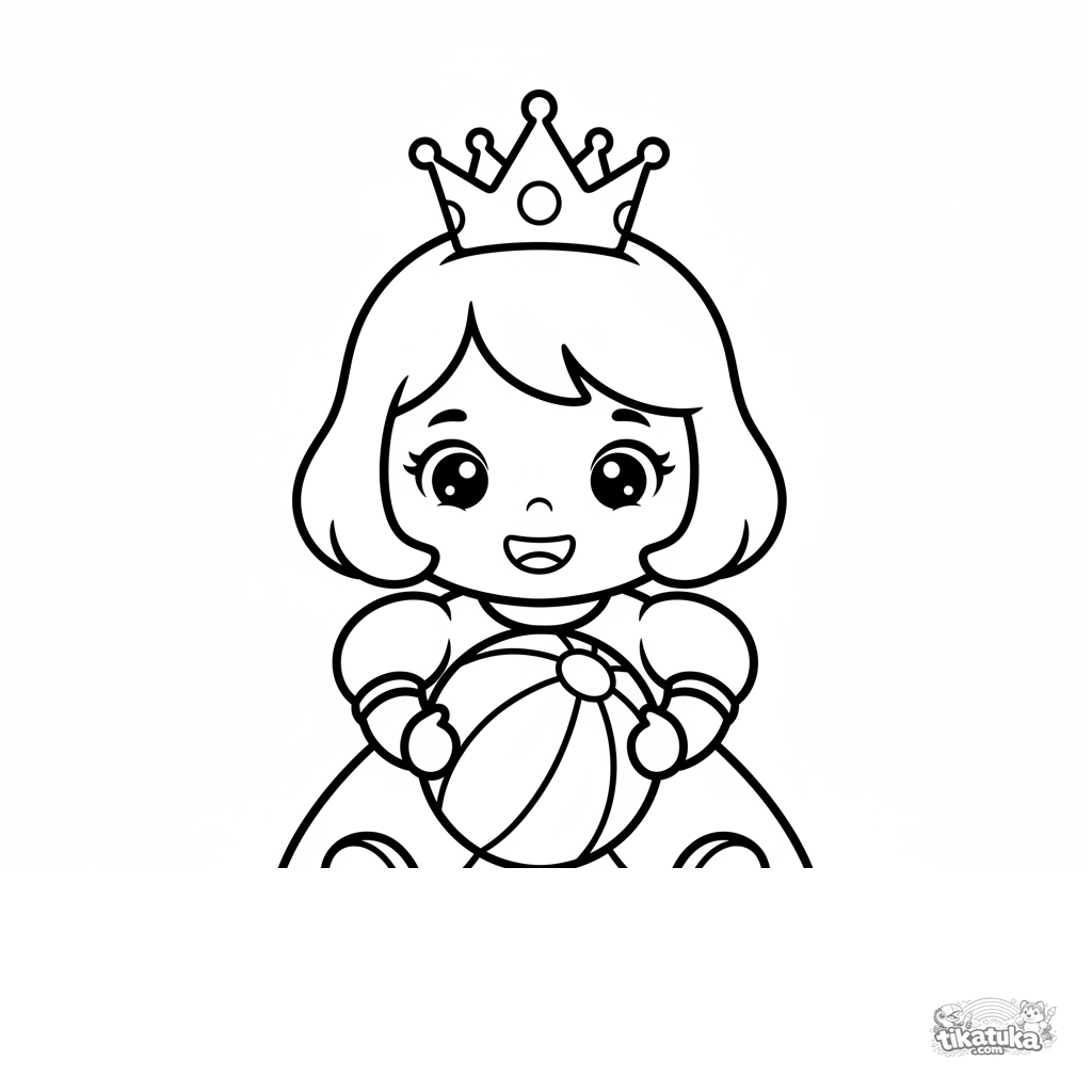 Página para colorir muito simples para bebês 2-3: uma princesa fofa com uma coroa grande sentada segurando uma bola. Formas grandes, contornos grossos, perfeita para primeiros lápis.