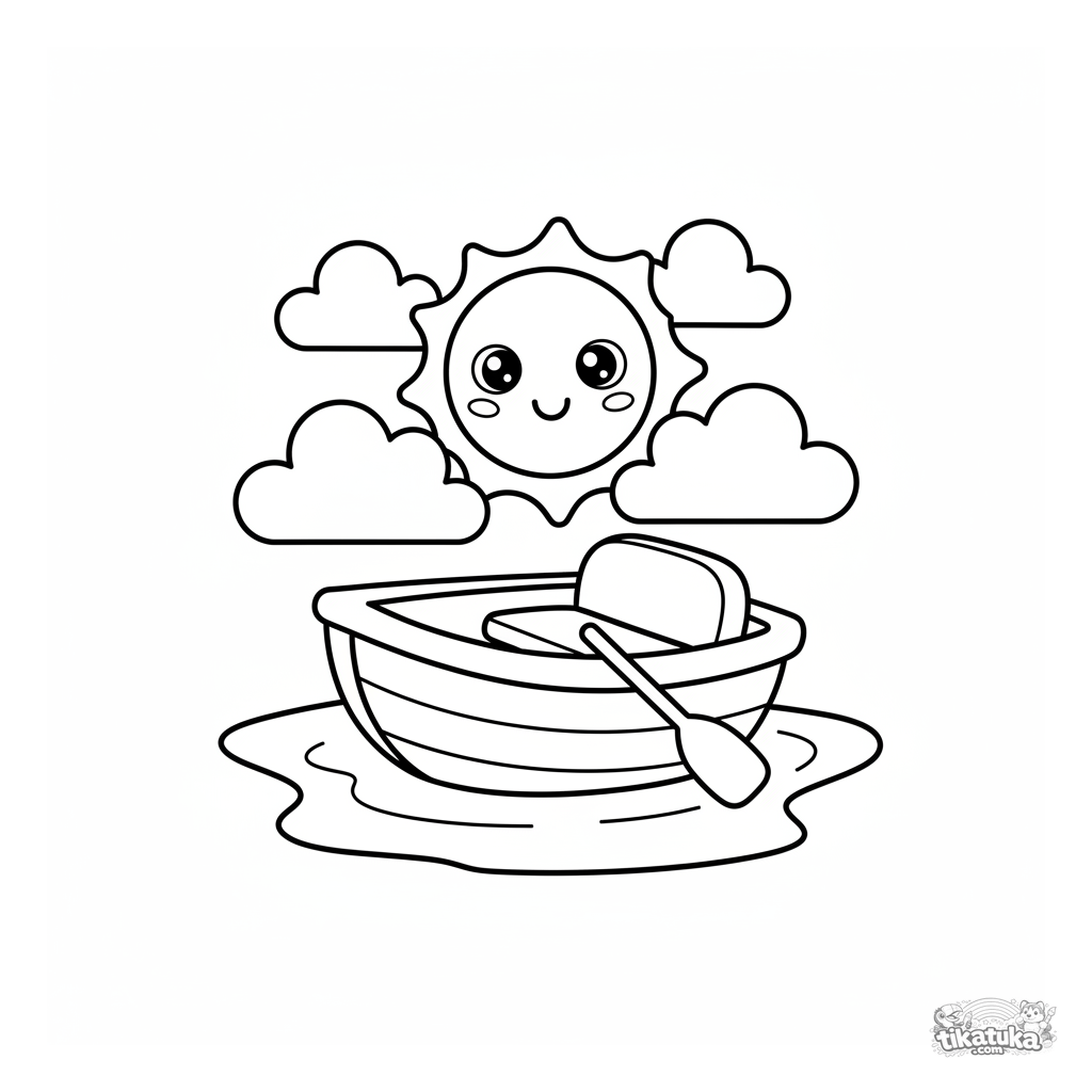 Página para colorir muito simples para bebês 2-3: um barco redondo flutua em uma lagoa calma. Formas grandes, contornos grossos, muito espaço aberto para colorir.