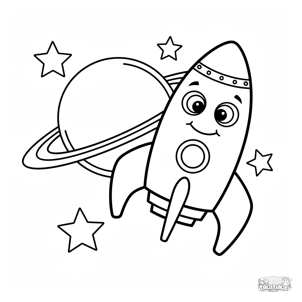 Página para colorir muito simples para bebês de 2-3 anos: um foguete sorridente voa ao lado de um planeta com anéis contra um fundo estrelado.