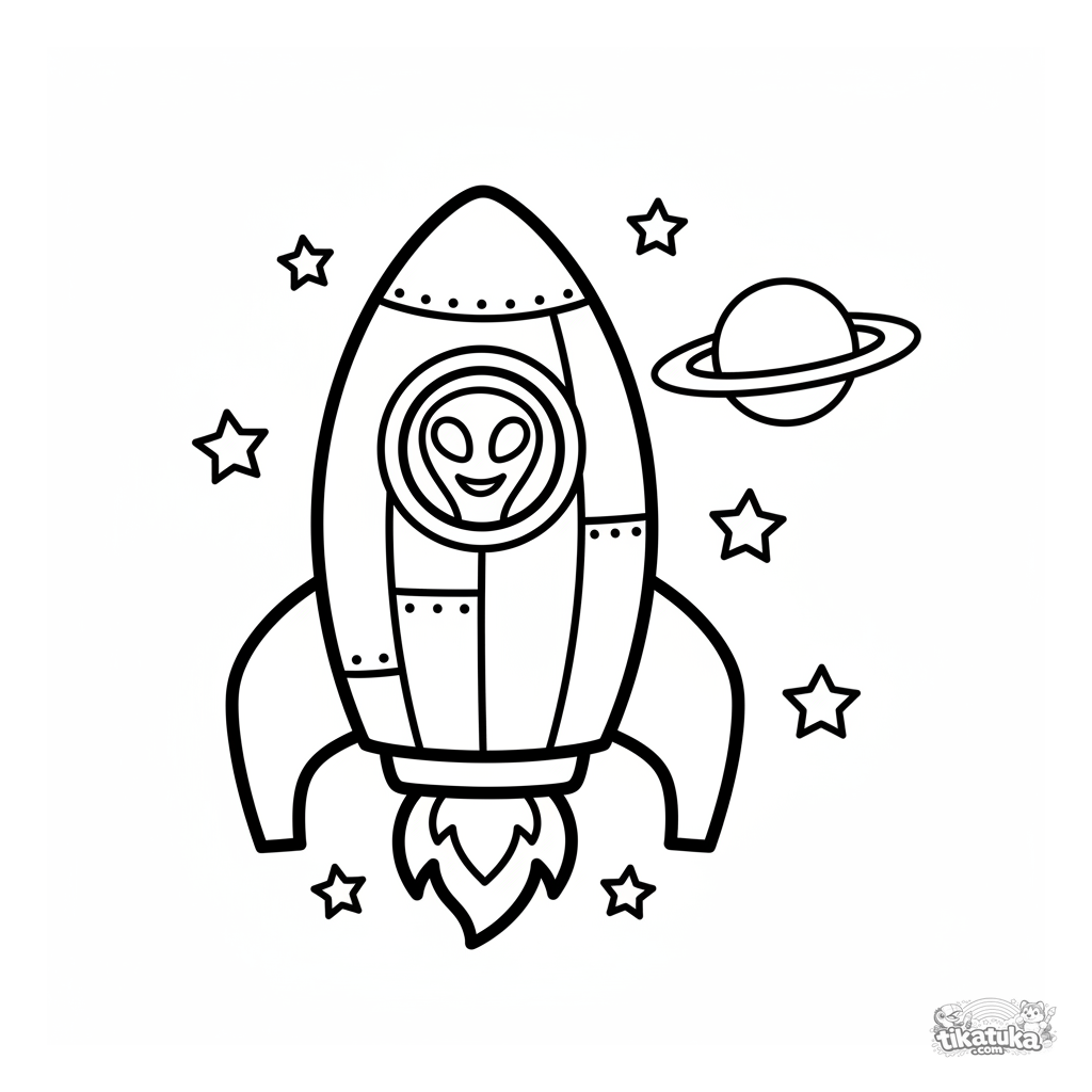 Página para colorir muito simples para 2-3 anos: um foguete feliz com um alienígena sorridente na janela voa entre estrelas. Formas grandes e fechadas.