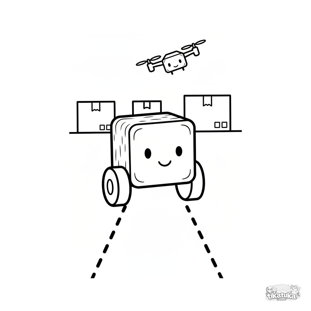Página para colorir para bebês 2-3: um robô cubo simples rolando em um armazém. Áreas enormes para colorir, formas muito simples, rosto sorridente.