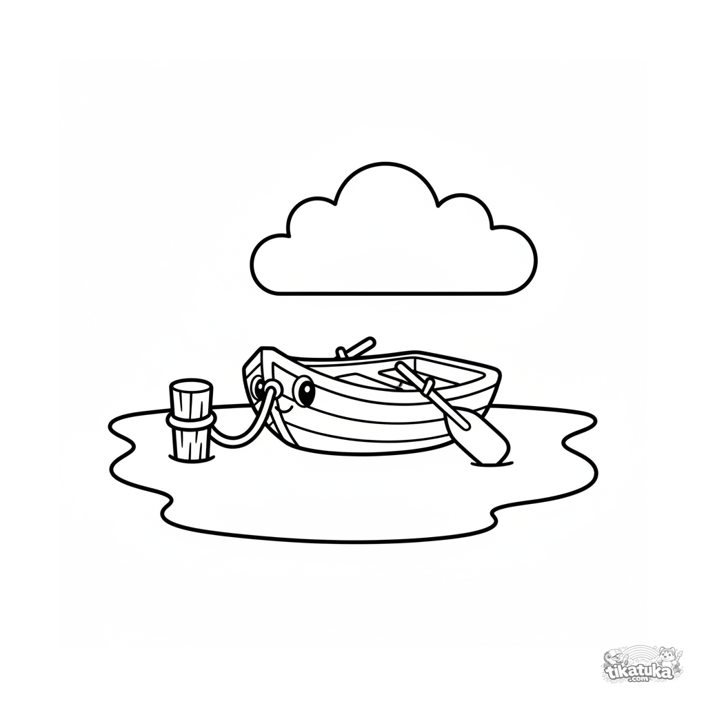 Página para colorir muito simples para bebês de 2-3 anos: um barco a remos de madeira amarrado a um cais. Formas grandes e claras.
