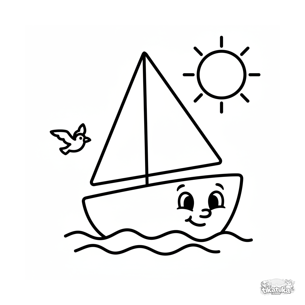 Página muito simples para colorir para crianças pequenas de 2 a 3 anos: um veleiro sorridente no porto ensolarado.